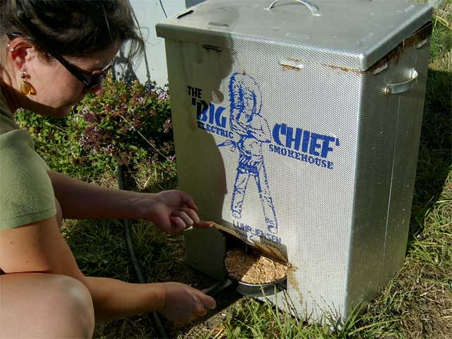 Preheat your smoker for 15 minutes to get it up to temperature. Put your rack of fish into it, and add your wood chips to get it smoking. The amount of wood chips and what type you use are completely up to your tastes. For this recipe in a Big Chief Smoker, we are using one pan of alder chips at the start, and one pan of apple chips after one hour. The complete smoking/drying time is about six hours. Again, this is done to taste, and due to wind and temperature fluctuations. Check on the appearance of the fish after about five hours, and make a judgement from there.