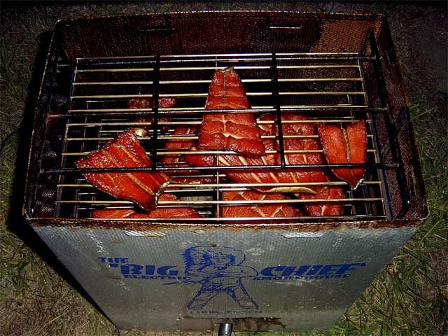 Above-right is what the fish looked like after six hours in the smoker. Notice that the thin tail pieces are up top and the thicker shoulder fillets are at the bottom.